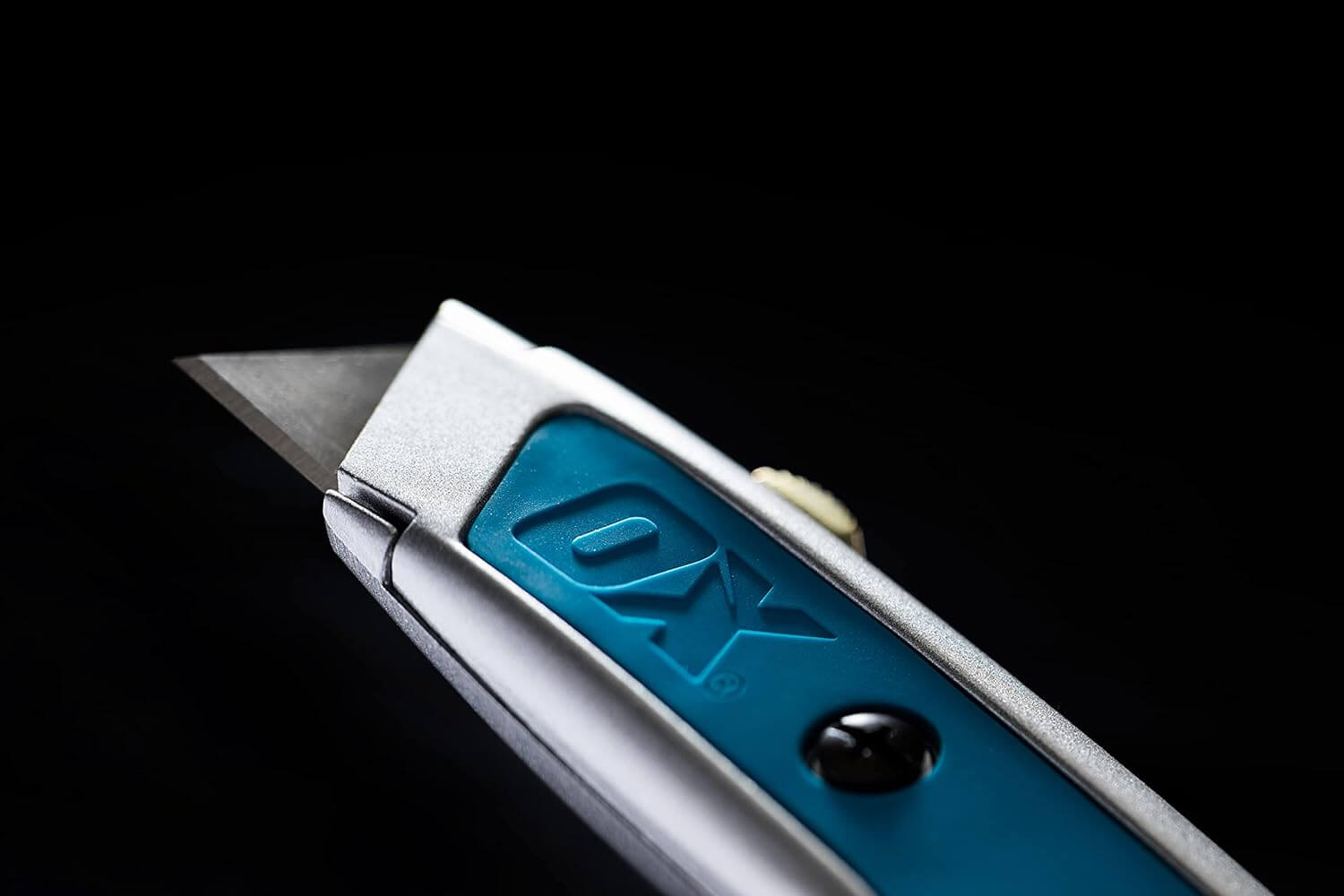 OX Tools Retractable Utility Knife has ultra sharp cutting blade. Ergonomic body shape for comfort during long periods of use. Easy slide retractable blade. Heavy duty metal construction and soft grip insert for added grip.